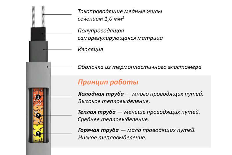 Саморегулирующийся кабель — автоматически регулирует мощность, в зависимости от окружающей температуры. Теплоотдача по всей длине кабеля может быть разной. Минимальный риск перегрева.