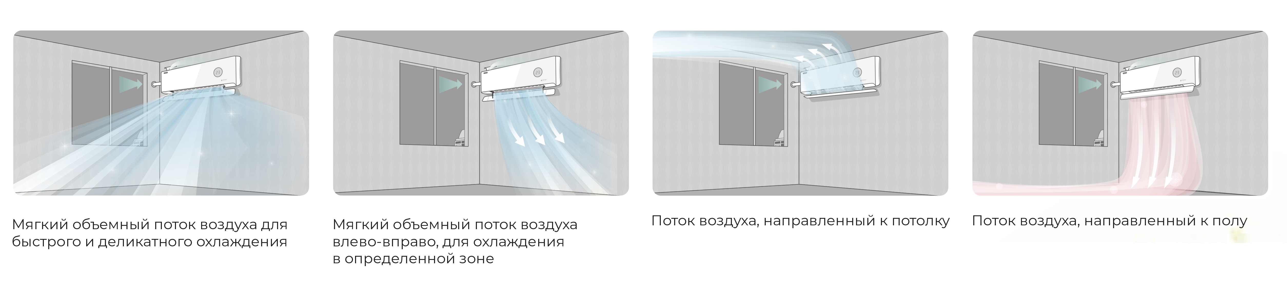 • Технология мягкого обдува — необычные вертикальные заслонки с перфорацией создают рассеивающий эффект, мягко распределяя поток воздуха по всему объему помещения.