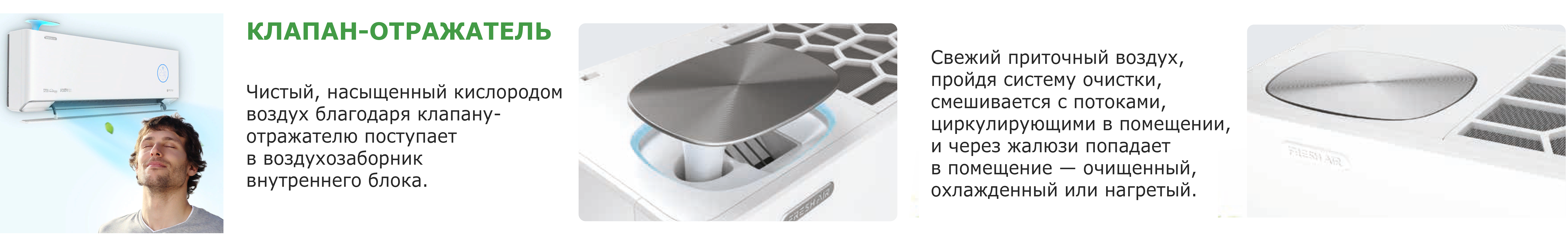 • Встроенная приточная вентиляция — обеспечивает поступление свежего уличного воздуха со скоростью до 60 м3/час. Система способна работать при температуре на улице до -15 °С.