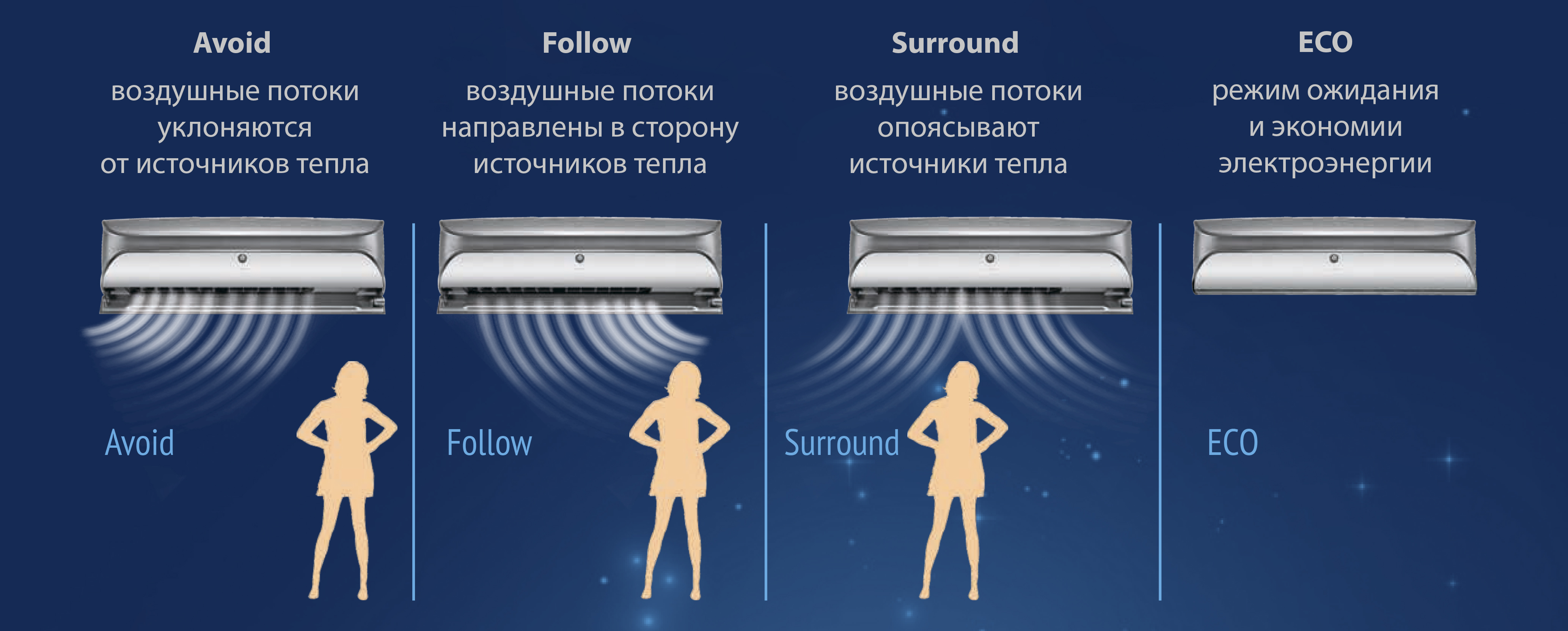 - Технология «I SENSE» — интеллектуальное сканирование помещения на источники тепла. В зависимости от полученных данных система выстраивает свою работу, создавая максимально комфортные температурные условия для пользователя.
