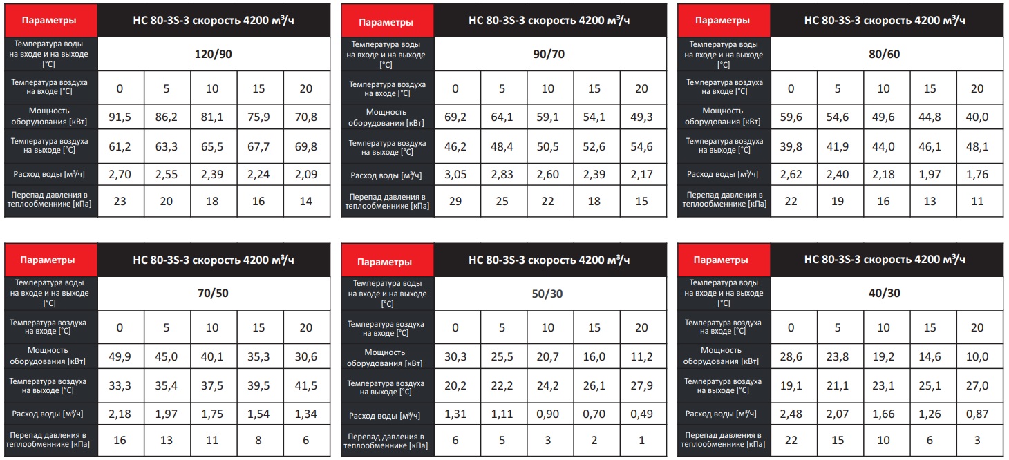 Тепловые характеристики приведены при температуре воздуха на входе +0 °С, максимальном расходе воздуха и максимальной температуре теплоносителя (указанной в таблице тепловой мощности от производителя).