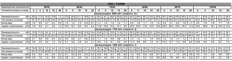 Тепловые характеристики приведены при температуре воздуха на входе +0 °С, максимальном расходе воздуха и максимальной температуре теплоносителя (указанной в таблице тепловой мощности от производителя).