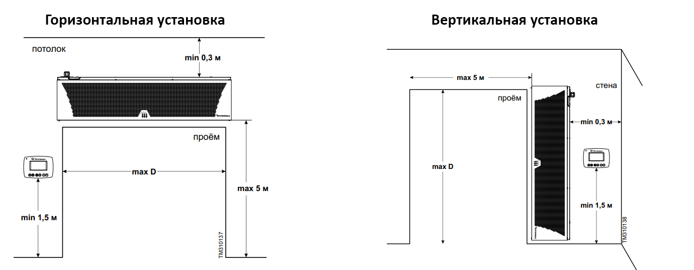 Тепловая завеса, в зависимости от проектного решения может использоваться для защиты как смесительного, так и шиберующего (отсекающего) типа — от прямого контакта с наружным воздухом через открытые двери в холодный период времени. Устанавливается внутри помещения, горизонтально над проемом или вертикально, сбоку от него, как можно ближе к краю. При большой ширине проема можно располагать сразу несколько завес вплотную друг к другу и управлять ими с одного пульта. Подходит для установки в складских помещениях, гостиницах, ресторанах, супермаркетах и др.