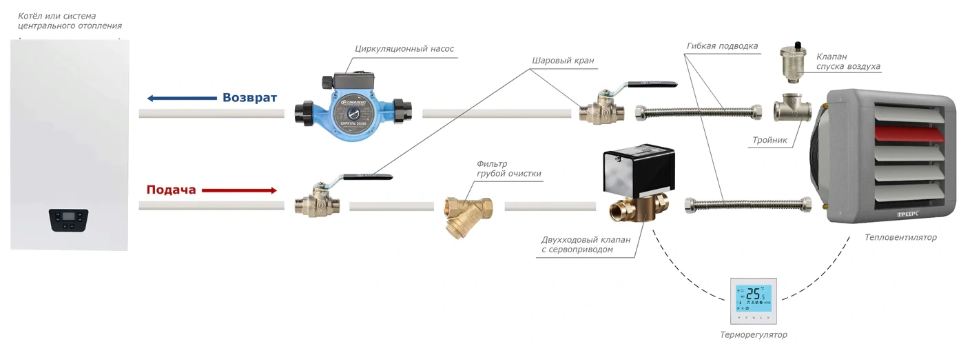 Тепловентилятор подключатся к источнику горячего водоснабжения или отопления с помощью гибкой подводки. Принцип работы основан на протекании горячей воды через теплообменник, который отдает тепло струе нагнетаемого воздуха. Монтаж может быть настенным или подпотолочным, крепится на поворотную консоль (идет в комплекте).
